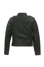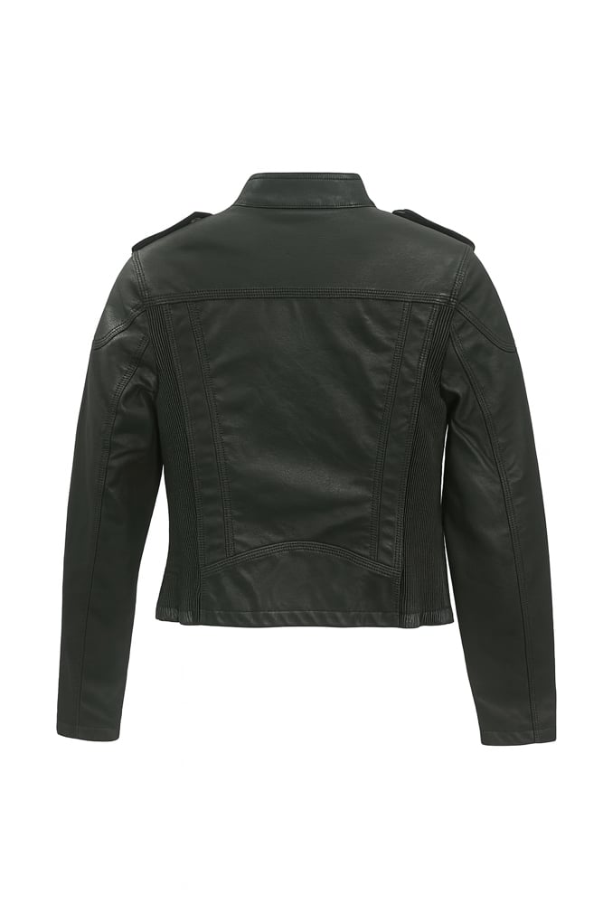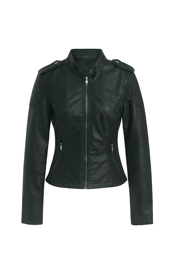 This sleek women's faux leather jacket combines edgy style with everyday versatility. Crafted from premium quality faux leather, this moto-inspired jacket features a flattering fitted silhouette that accentuates your shape while providing comfortable movement. The classic stand collar with snap-button detailing adds a touch of sophistication, while the signature shoulder epaulettes deliver that iconic biker aesthetic. Functional elements include a smooth full-length front zipper closure and two zippered side pockets perfect for securing your essentials. The jacket showcases intricate stitching details throughout, including ribbed paneling on the shoulders and back that creates visual interest and dimension. Long sleeves with zippered cuffs complete the look. Whether you're pairing it with jeans for a casual weekend outing or dressing it up over a dress for evening plans, this versatile jacket transitions seamlessly from day to night. The timeless black color ensures it coordinates effortlessly with any wardrobe. This jacket offers the perfect blend of fashion-forward design and practical functionality for the modern woman.